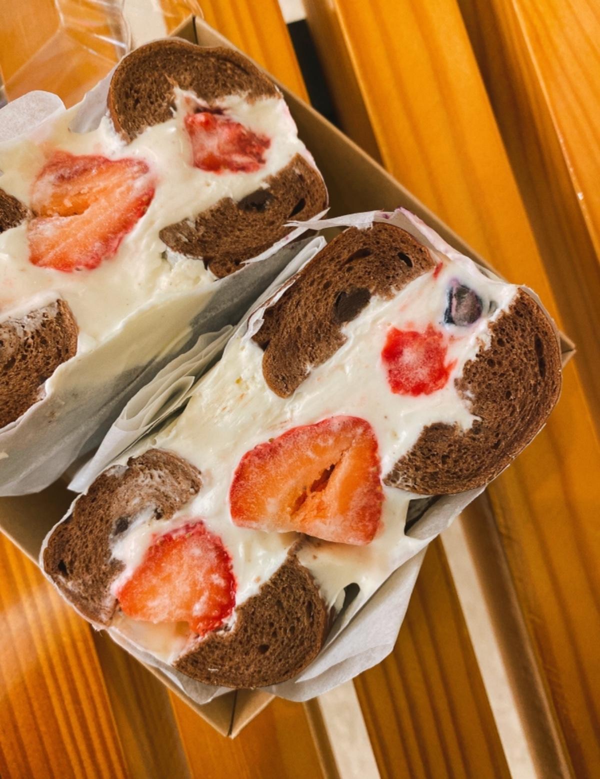 內餡66%增量,厚達6.5公分,選用苦甜巧克力貝果,夾上滿滿特製蜂蜜乳酪抹醬,濃郁乳酪奶香,搭上7顆大草莓🍓,還有紮實果肉的藍莓🫐,酸甜苦每個味道都完美搭配👍🏻