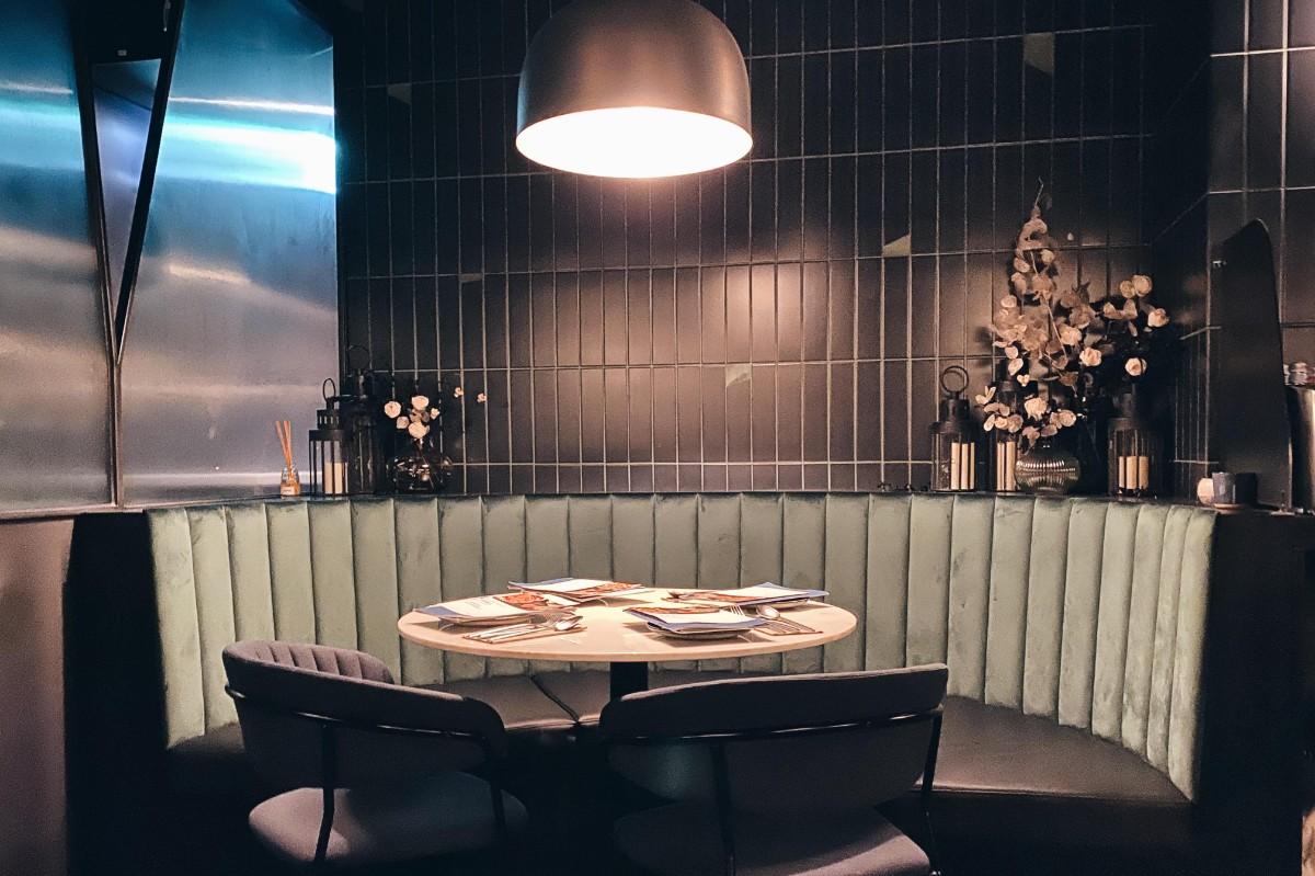入門的第一眼一定會先看到大大深水泥色的吧台,和半開放式的廚房.吧台前與左右都有座位,這邊算是第一用餐區吧.用鏡子增加空間的深邃度,即使使用全暗色系的裝潢也不顯壓迫.很喜歡藍色綠色天鵝絨和金色金屬件帶來的低調奢華感.記得訂位時特別註明要坐在前面區域喔!