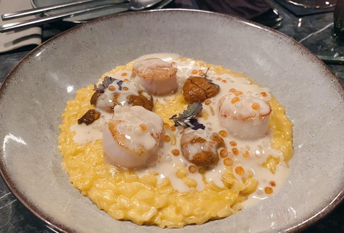 奶黃色的燉飯是先用海膽和味增燉煮後放上生食級的熟干貝和新鮮海膽,已是海味滿滿的一道餐點,居然在上桌時還又淋上了白酒奶油鮭魚卵醬,根本是海鮮澎湃包,入口鮮味整個在口中炸開,在吞下之前突然感受到一絲絲清爽的餘韻...天啊,是用柚子將所有鮮味收入清爽中,即使一個人吃完整盤都不會感到過膩.