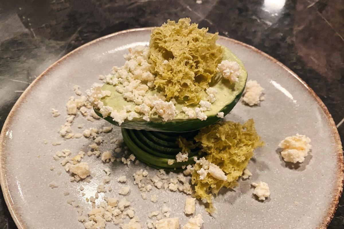 將很多人不喜歡的酪梨做成像冰淇淋一樣的凍糕,外層是抹茶白巧克力,底部是冷凍後的抹茶鮮奶油.原以為綠色的是七葉蘭或是抹茶風味的海綿蛋糕,沒想到酪梨這種沒甚麼味道的水果在做成蛋糕後會帶著微微的清香,更令人驚訝的看起來像是上一道甜點白乳酪碎冰的東西,居然是液態氮急速冷凍後的葡萄柚卡士達!