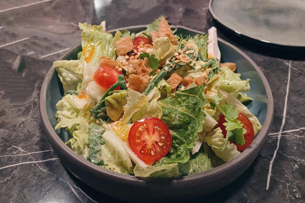 先上桌的口水雞沙拉以傳統凱薩沙拉為發想,但將常見的GRILL CHICKEN碳烤雞肉換成帶著四川微辣風味的口水雞.低溫舒肥的帶皮雞排,多汁而軟嫩.以早餐點常見的油條取代麵包丁帶來的酥脆口感,最後在淋上紅油醬汁,微辣而爽脆,非常適合夏日的夜晚的開胃菜.