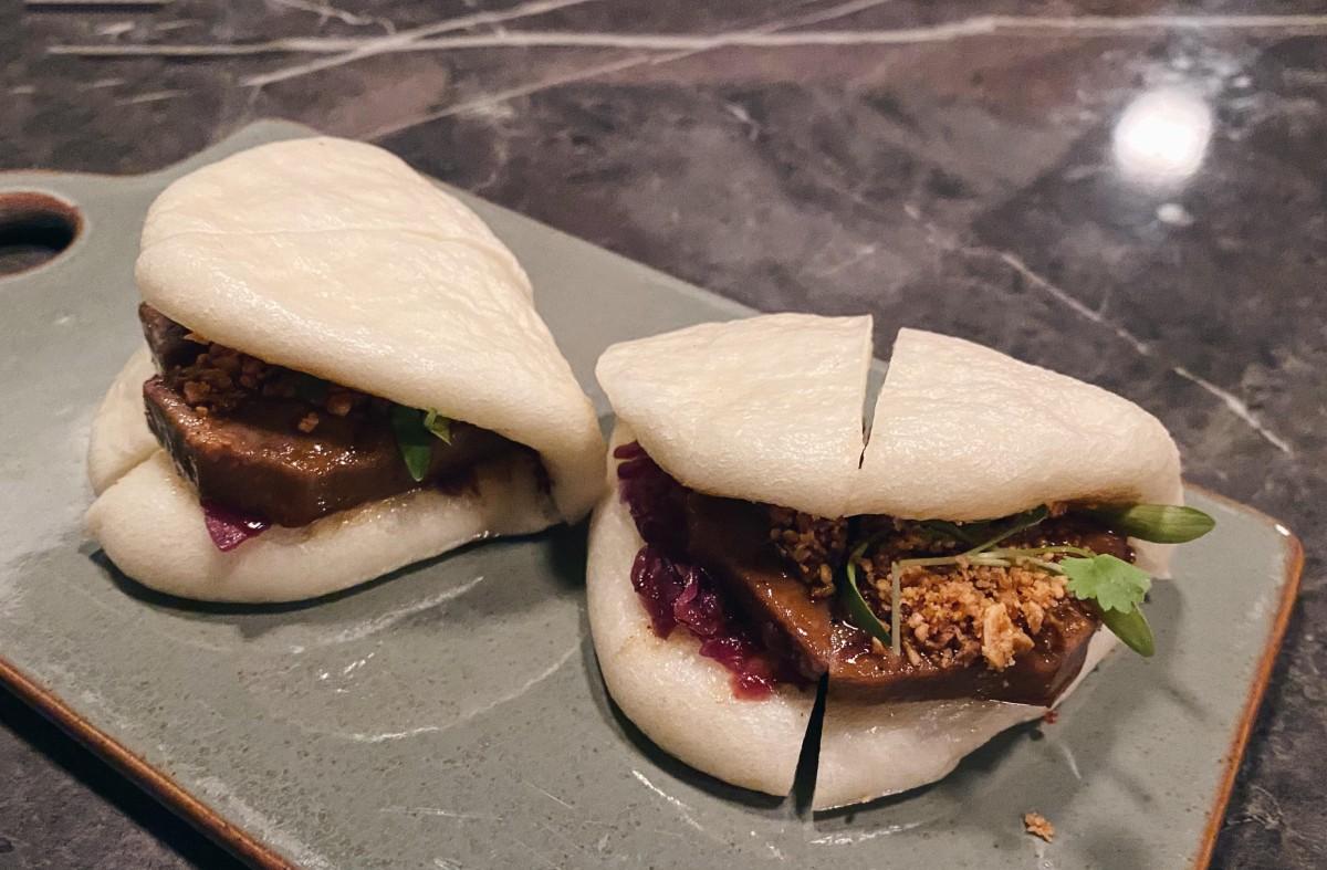 沒錯!這就是從台灣紅到紐約倫敦的割包本人!上桌前廚房會將割包對切,對四人用餐的我們來說非常方便,也不會吃了割包之後就吃不下別的東西!將常見的內餡三層肉換成細緻柔嫩的燉煮牛舌,用堅果碎取代花生粉,酸菜換成酸甜紫高麗菜,再加上一點微辣,即使用西式做法一樣吃出澎湃滿滿!