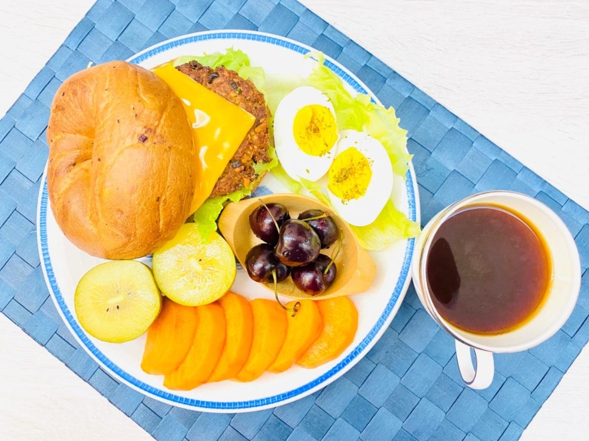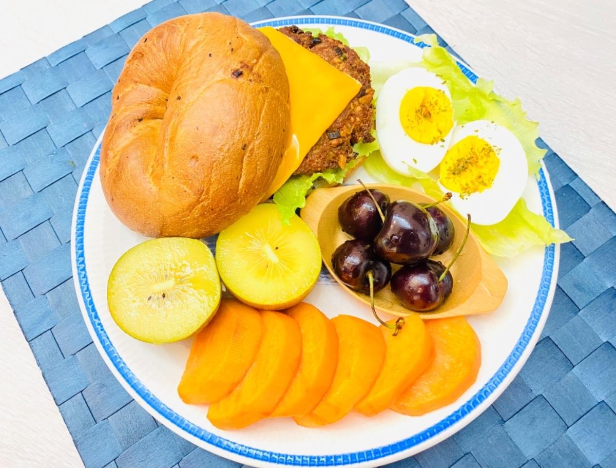 主食:堅果漢堡排水煮蛋生菜起司貝果