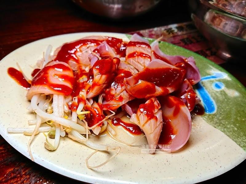 其實昨天晚餐才吃了燙魷魚,但看到菜單上魷魚佐五味醬,想起來就流口水,於是決定再點盤來吃,魷魚下鋪著豆芽菜,咬起來脆口,五味醬酸甜又帶點蒜香,很合拍!