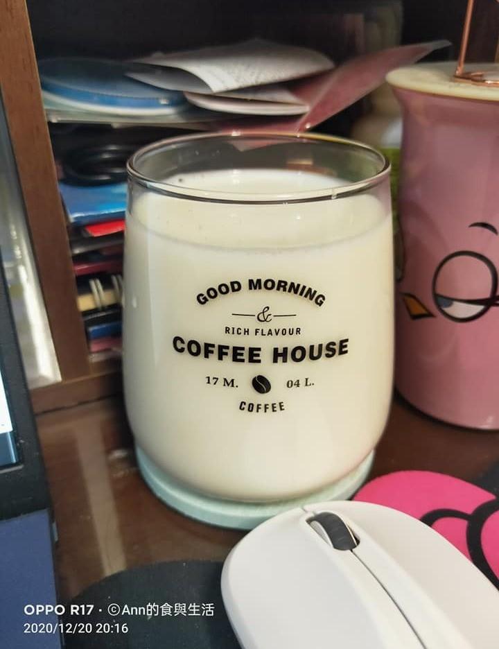3. 倒入鮮奶杯子的1/2處(我就倒到我杯子的最中間的文字處)