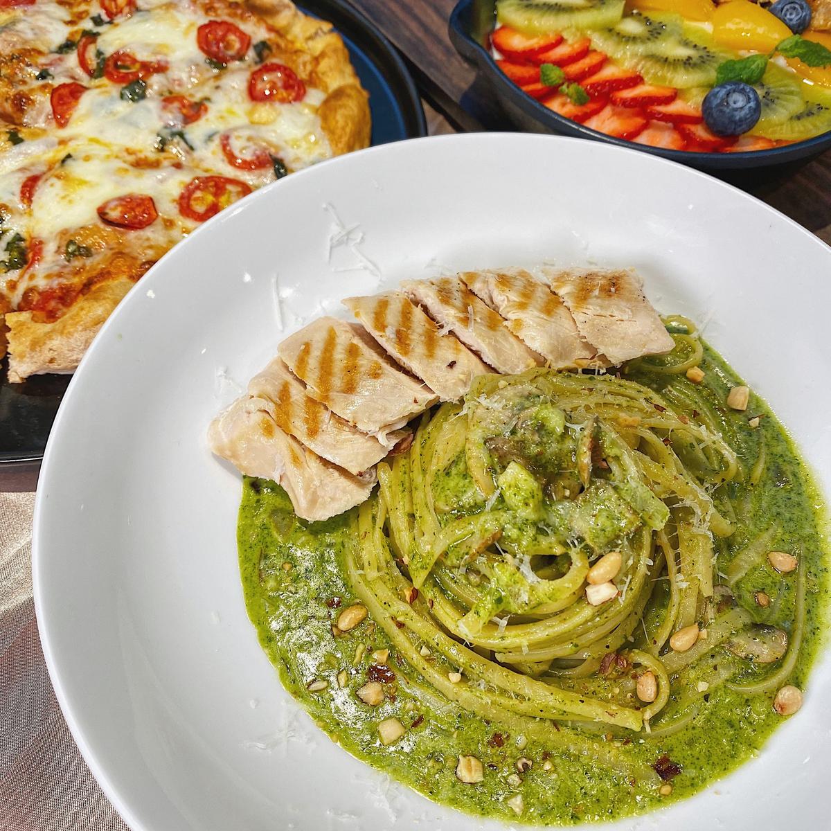 濃郁的青醬搭配上奶油的香氣,最後加入少許的堅果,讓這道料理的調味製作的非常有層次感,至於雞肉的部分是用舒肥雞胸肉,吃起來鮮嫩無比