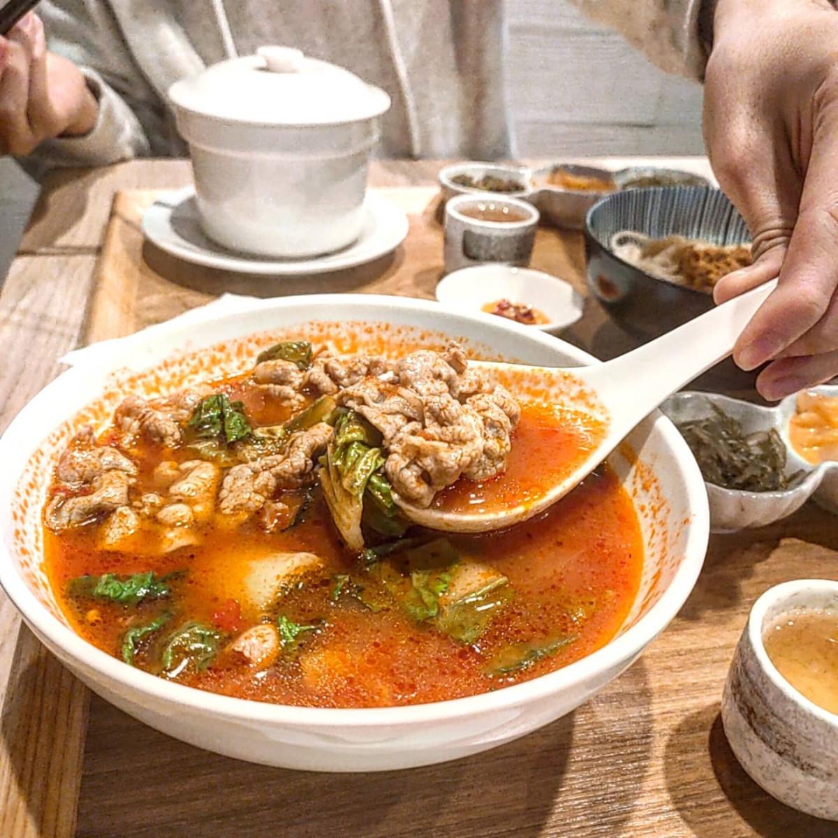 老鍋香麻辣麵帶有微微的辣度,喜歡吃辣的話,也可以請店員再增加辣度。麵條偏粗,口感Q彈帶有嚼勁,我覺得最厲害的地方在於麵條會吸附醬汁,吃起來很有層次。而慢活細燉番茄湯不愧是店家的招牌,番茄🍅的味道濃郁,湯底卻非常清澈僅保留了番茄獨有的鮮甜與香氣。肉類的部分有豬肉和牛肉可供選擇,樹懶選擇了豬肉,肉片本身非常的新鮮,完全不會有豬肉的臭味,分量也蠻多的唷😋