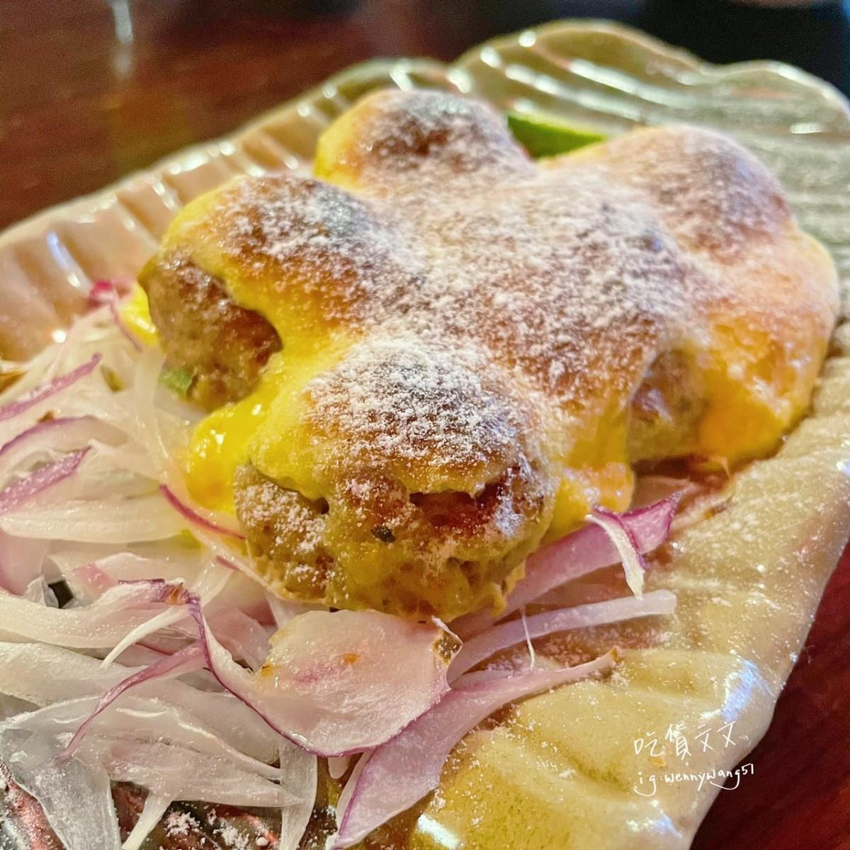 將口感Q彈的雞肉丸淋上香濃的起司後再灑上一些糖粉後下去炙燒,