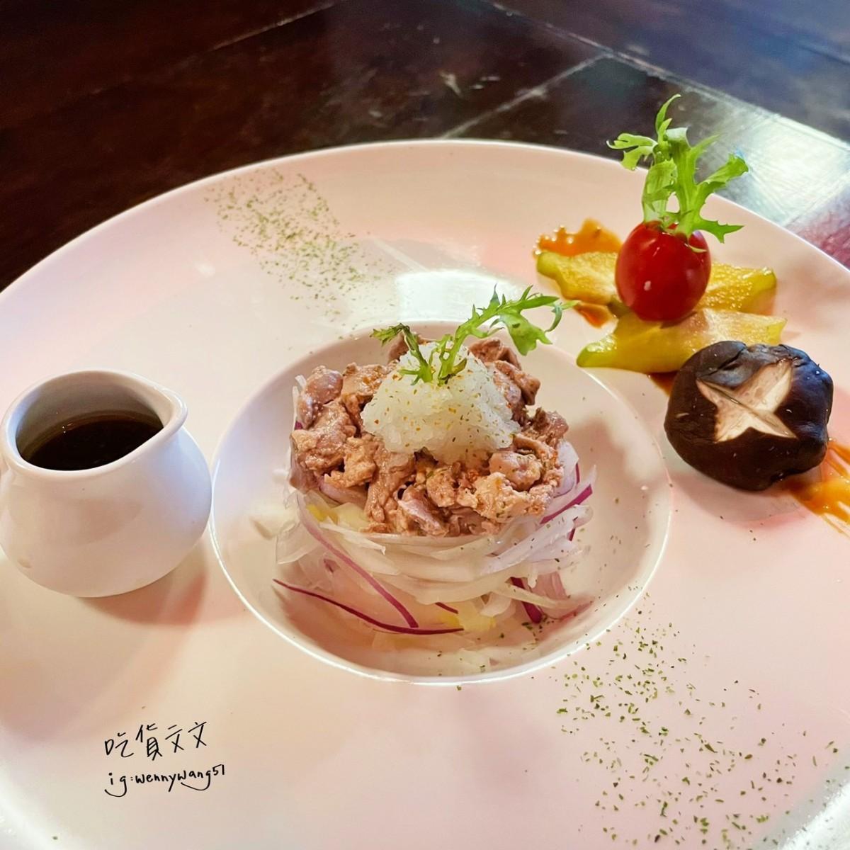 淋上和風醬油的鱈魚肝搭配著底層的洋蔥一起吃口感真的很特別,