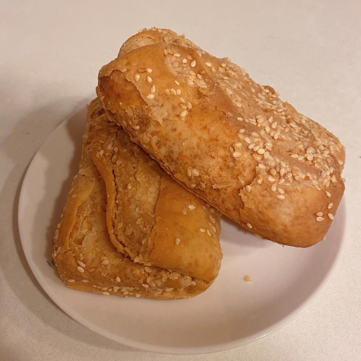 千層燒餅比較扎實,嚼久香氣更重,不確定是不是有加花生,嚼久會有花生的香氣留在口中,我覺得他雖然叫燒餅但口感比較偏像酥餅或餅乾!它雖然很香且滿好吃的,但因為滿油的且太札實,所以吃一半就很容易覺得很膩!常溫放兩天吃起來感覺不變,聽說加熱後更香更酥脆,但嘗試用烤箱烤過覺得油感更重不是那麼喜歡!