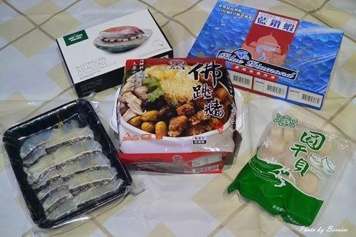 豪華海鮮極品煲內有:2公斤的高CP值佛跳牆、1公斤甜度等級最高的藍鑽蝦;高級鮑魚、18~19粒大顆干貝及珍珠龍虎斑去刺魚片,共一湯四菜;自從有外帶年菜後,佛跳牆就一直是我家桌上必備品之一,因此看到這組合立馬就決定這組