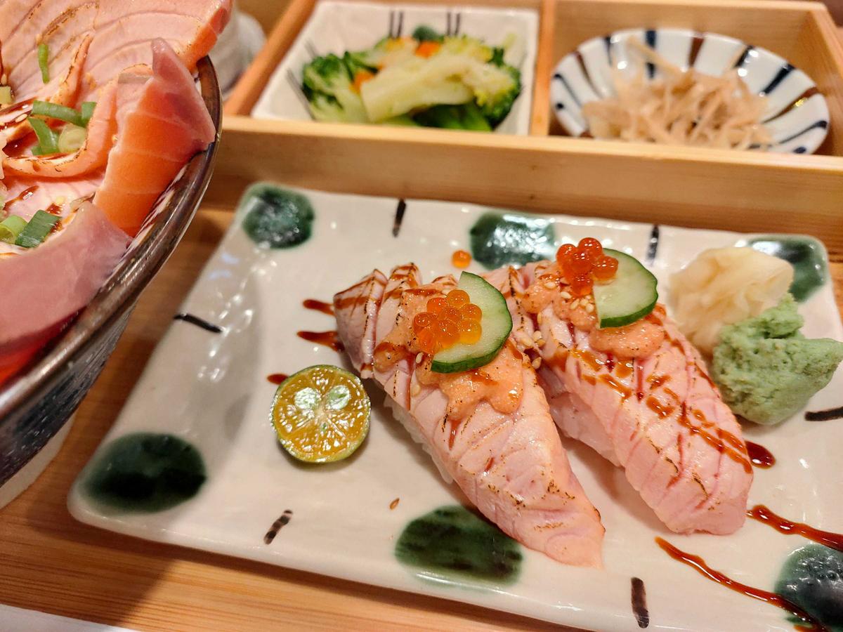 鮭魚滿貫雙拼是生鮭魚和熟鮭魚的組合,可以吃到兩種口感,上面還灑了芝麻,更是增添了層次感😋