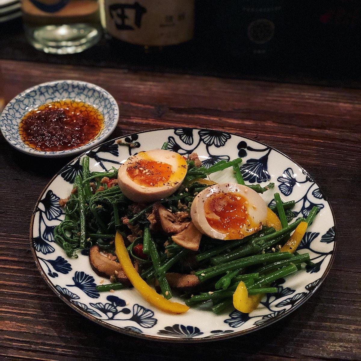 龍鬚菜、香菇、黃椒與豬絞肉拌炒,上面再放上兩瓣溏心蛋,看~他在對你笑(X)
