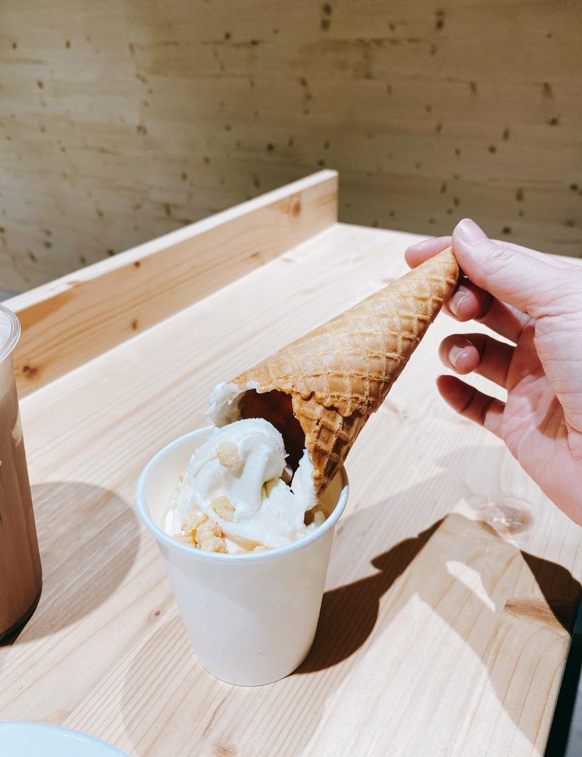 #手工鮮乳霜淇淋 $130 本來招牌是卡布里布理咖啡霜淇淋,但我只喜歡喝咖啡,咖啡變成別種形式我都不愛(冰、麵包、蛋糕、糖果等等),所以我就點鮮乳口味,然後我不想要吃餅乾所以請他用杯裝,結果送上來長這樣!我也是哭笑不得😅霜淇淋的美感都沒了😂
