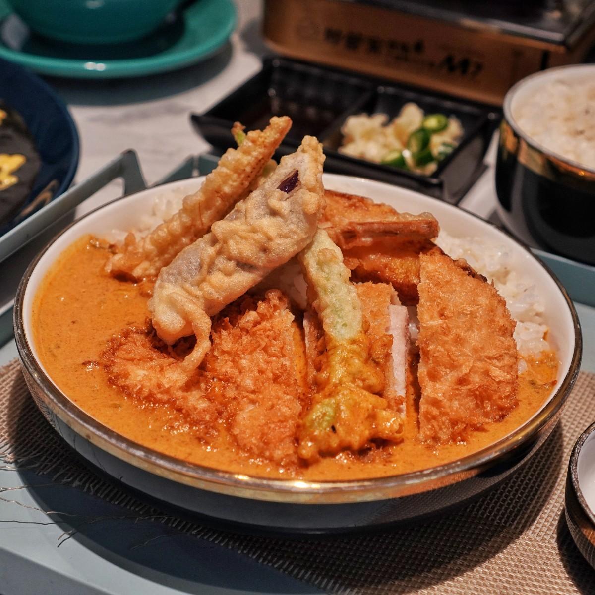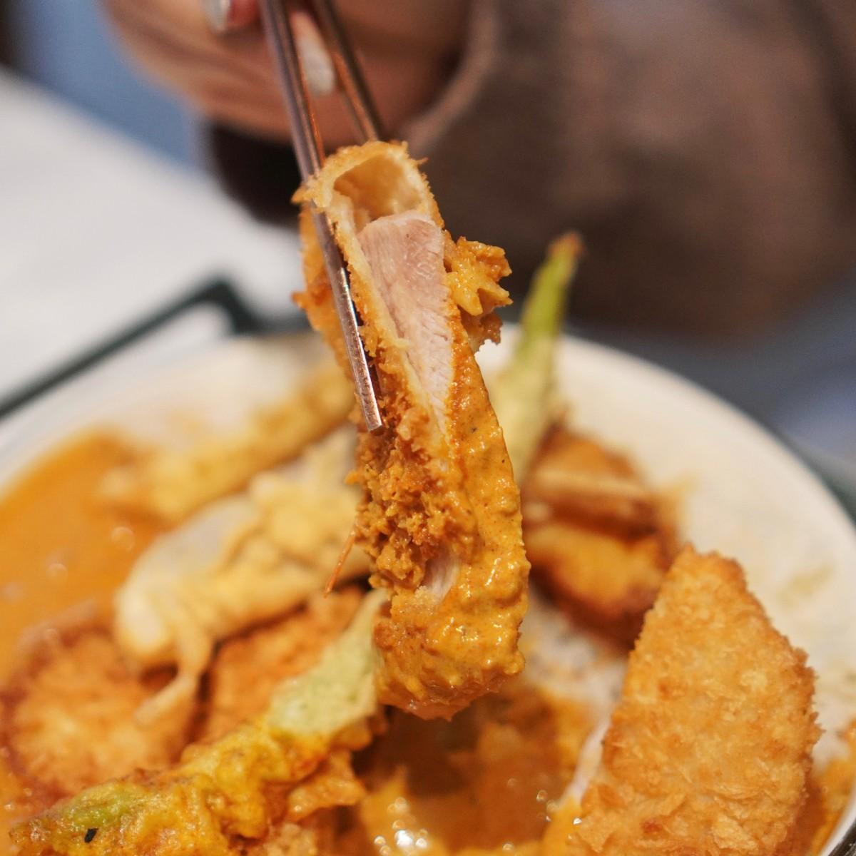 以大量番茄熬煮的濃郁咖哩,還會加入特調的馬拉薩香料,吃起來溫潤爽口不刺激,入喉後還會帶出迷人的果香尾韻,一口咖哩配一口白飯,不知不覺就一口接著一口吃光光😋切面超厚的炸豬排吃起來超過癮!