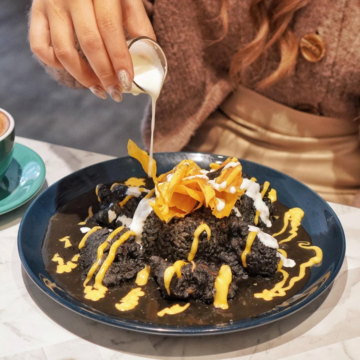 由各種香料組合,再加上墨魚汁及竹炭熬煮製作而成,吃起來有著濃郁海味,帶點辣度的口感很開胃~拌上起司醬跟酸奶醬後,辣度從小辣被調和到微辣的程度,口感更是多了一種奶香的滑順感!沾滿黑咖哩的黑炸雞,肉質更是鮮嫩多汁好入口🤤
