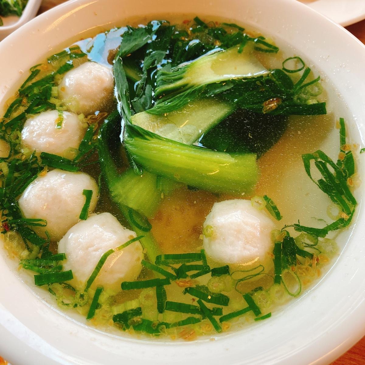 另外湯品是魚丸湯,湯頭和一般傳統的大骨清湯不同,多了油蔥的味道,喝起來比較油膩但是味道很夠,魚丸吃起來就比較一般。