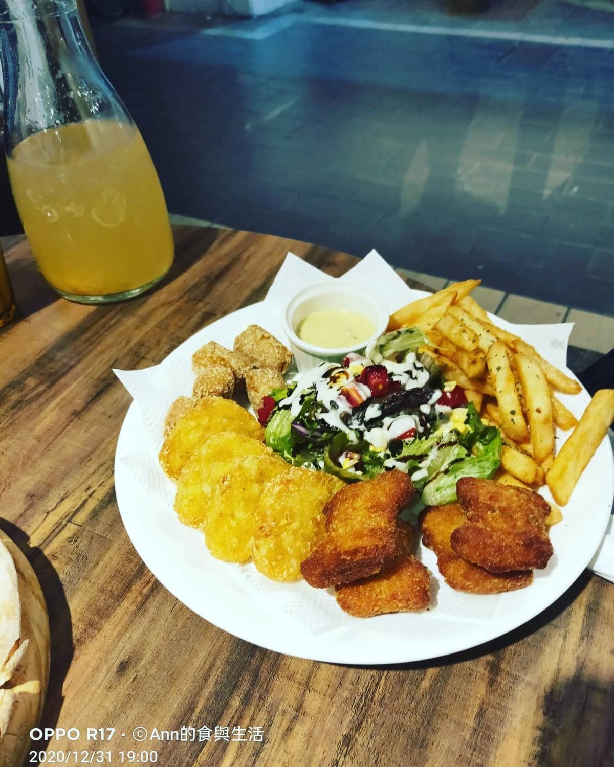 我們這次點購了一份雙人套餐(920元)包含一份開胃菜、兩份主食以及飲料一壺。開胃菜我們選擇的是"炸物綜合拼盤";主食分別是"經典瑪格"以及"奶油松露燉飯";飲料則是"蜂蜜檸檬柚香氣泡飲"。炸物綜合拼盤的仿鱈魚塊和雞塊都是用素肉製成,其中我最喜歡仿鱈魚塊的口感;馬鈴薯薯條也很是不錯。