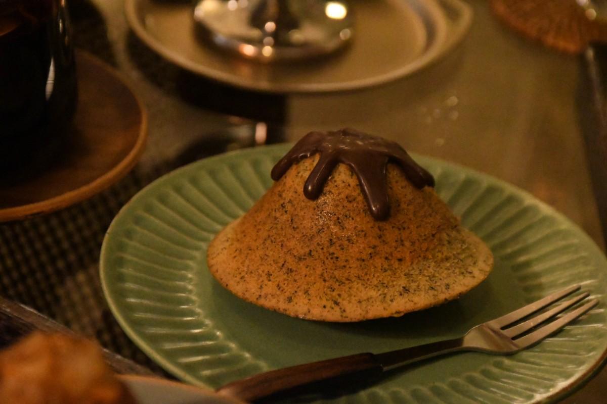 今天,我點的是鮭魚烤飯糰套餐、一杯來自哥倫比亞薇拉莊園,紫色卡杜拉的手沖咖啡,以及一份焦糖布丁。學姊跟我一樣點了飯糰,飲料是糖漬檸檬氣泡飲,甜點是伯爵茶口味的小山磅蛋糕。
