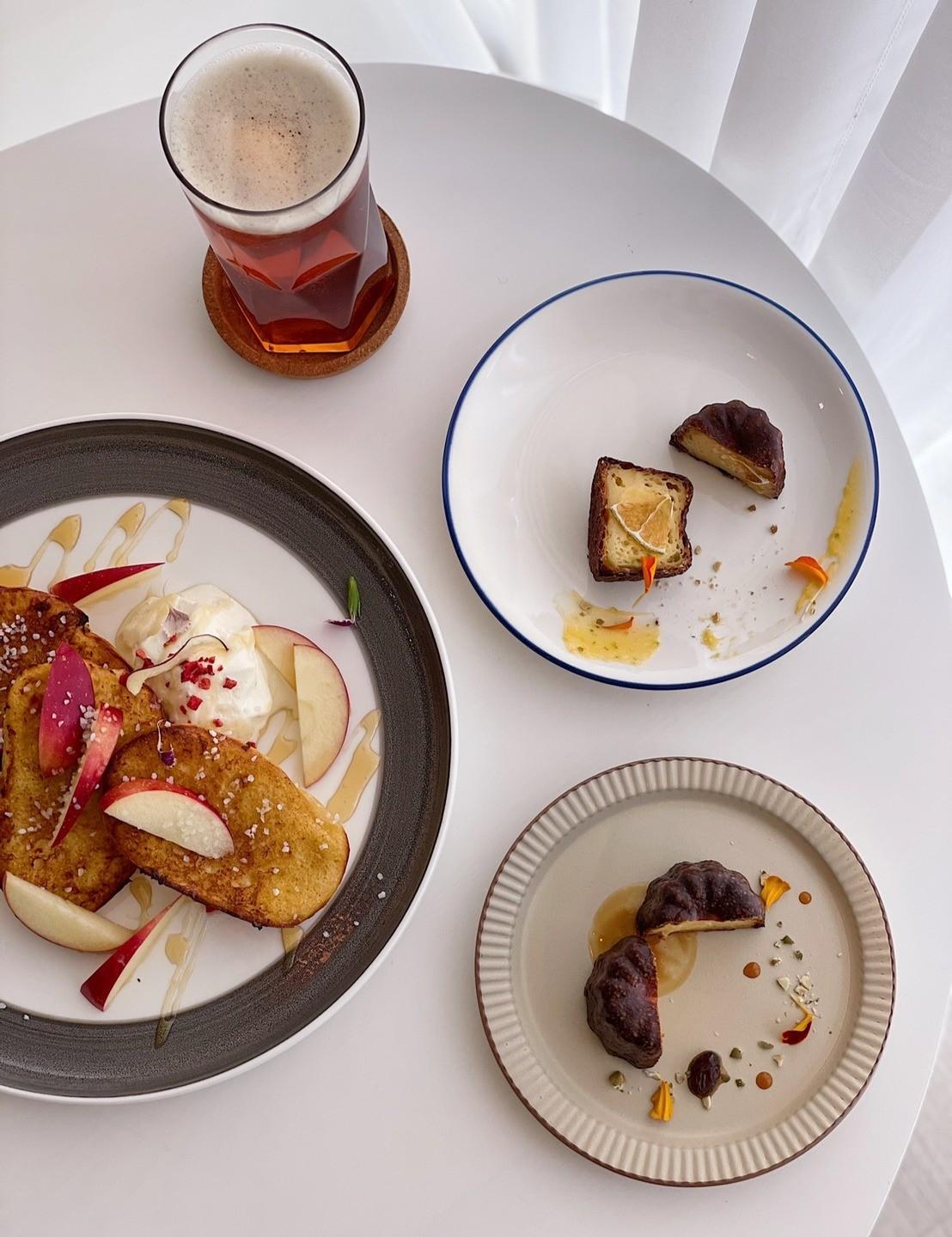 可麗露的擺盤好美,口感紮實與酥脆外皮,微濕潤的內餡,撒上些許鹽之花的可麗露,周圍還有一點法式檸檬奶醬,放上檸檬果乾作為最後點綴,整體酸度剛好也很清爽。原味可麗露則是放上酒釀葡萄乾可以搭配。