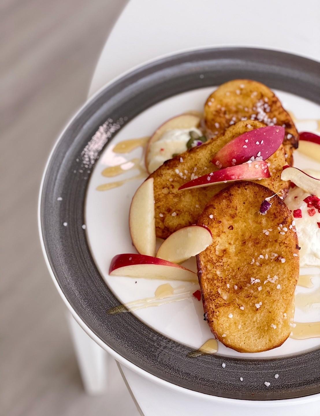 整體份量很足夠的法式吐司,搭配季節水果擺盤,外酥內軟的吐司,上面還有撒上些許的糖霜粒,淋上蜂蜜後更美味。