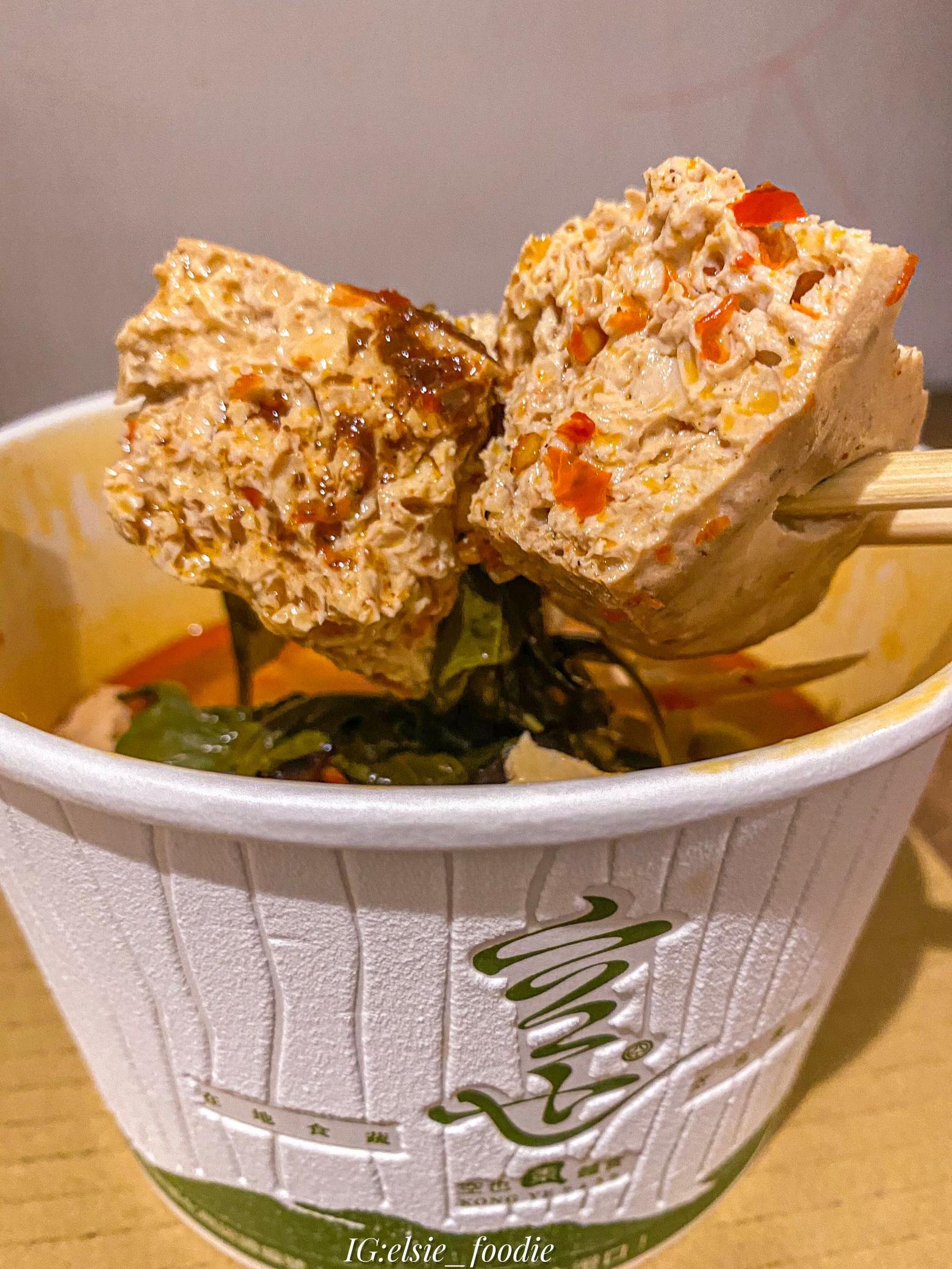 而且他們的調味足見用心,老豆腐吸飽微辣的湯汁,一咬就爆汁,完全沒有在吃素的感覺。