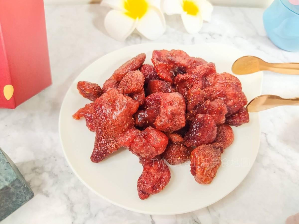 草莓果乾是用整顆草莓去除蒂頭之後去低溫烘烤的,有大顆有小顆,變成果乾的草莓顏色變成深紅色,表皮帶點糖漿的黏度,口感Q彈,吃得到草莓籽的顆粒,越嚼越香甜~