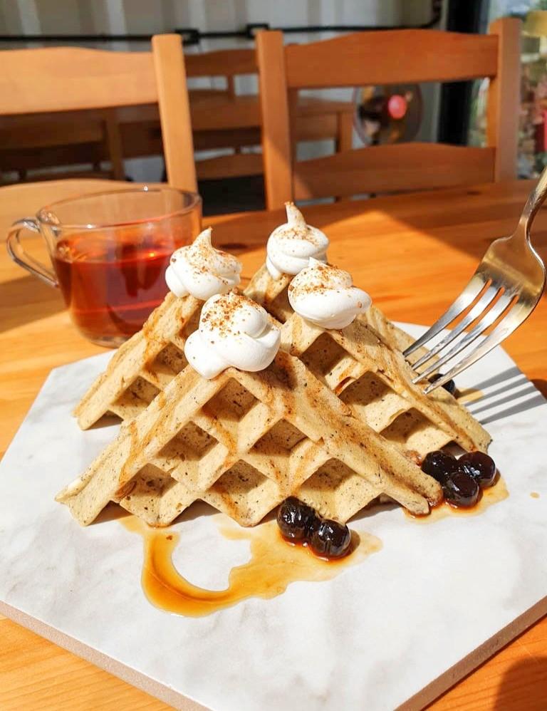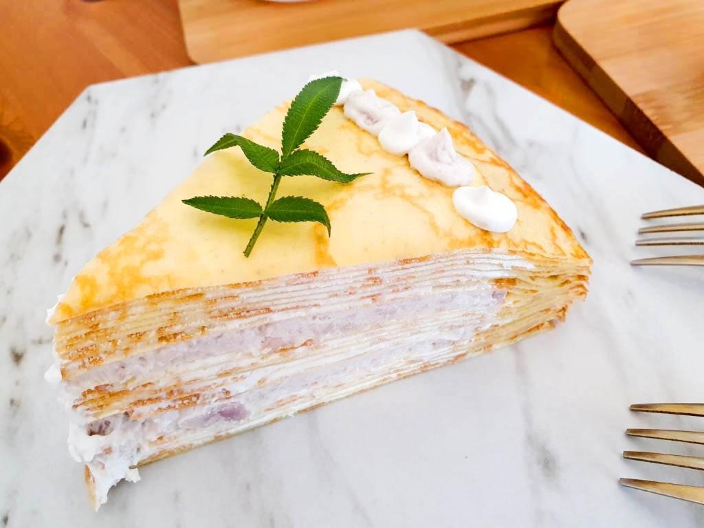 吃飽閒閒就來閒閒呷甜甜工作室🍰☕在白色貨櫃屋裡吃小山鬆餅喝紅烏龍,再來一塊芋頭千層蛋糕,咬得到新鮮芋頭顆粒🎏充滿蛋香的Q嫩麵皮+低糖鮮奶油,療癒的幸福下午茶,CP值很高的景觀餐廳喔💕