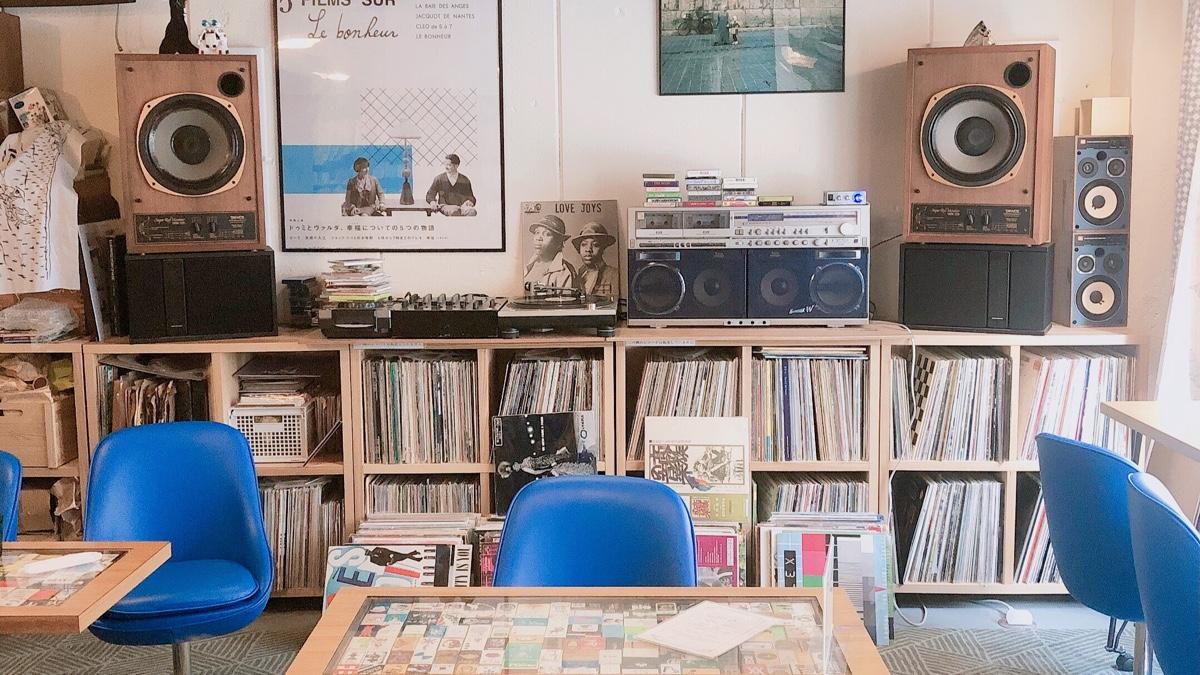 身後還有年代感的黑膠唱片的機器