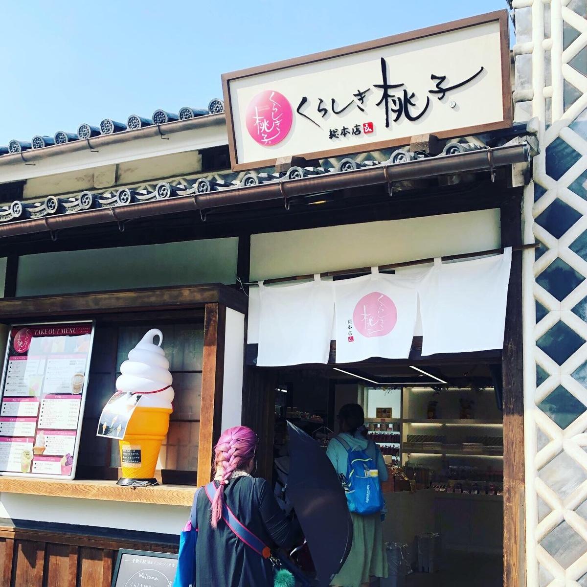 倉敷有名的是丹寧製品,黑白格紋房屋還有好吃的白桃和麝香葡萄,白桃產季是7-8月,麝香葡萄產季是9-10月,所以7-10月是果物接力賽啊!