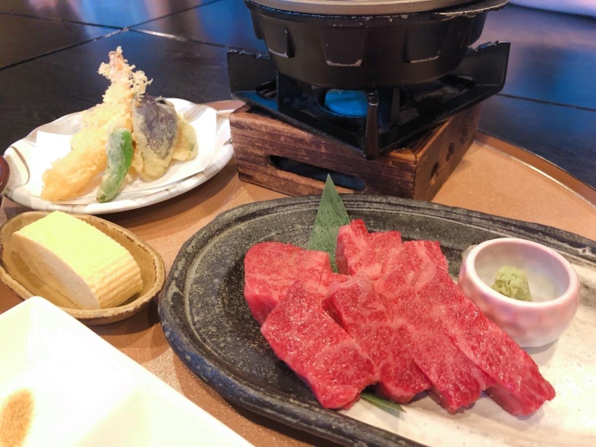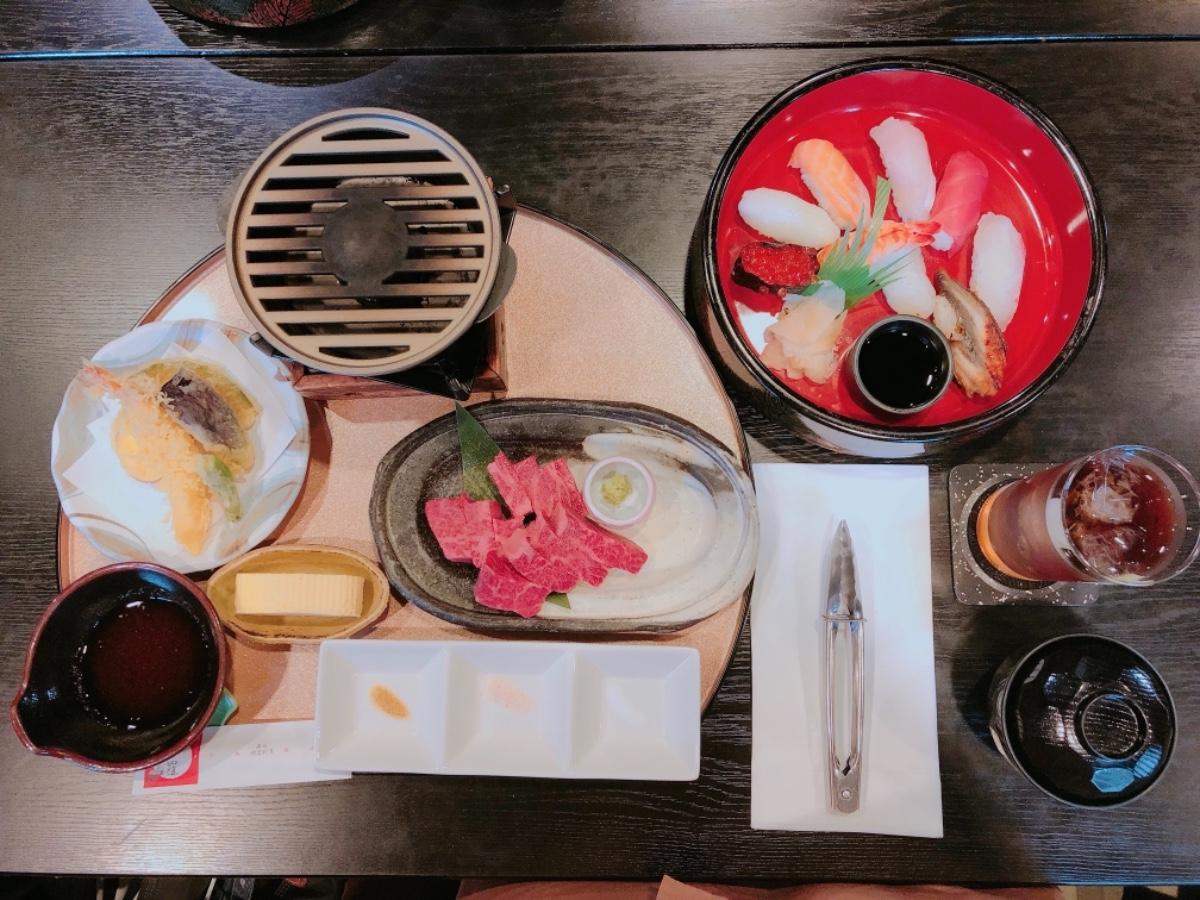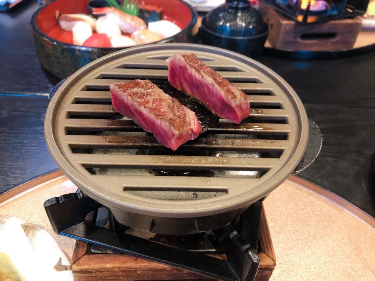 這次點餐的是近江牛燒烤套餐,客人可以親手把牛烤至喜歡的程度。餐點除了包括近江牛肉粒外,當然少不得日本人愛吃的天婦羅、玉子燒、刺身、以及麵豉湯和飯,食物的份量頗多,但價格也只是4500円,這樣的食物質素,配上這個價格實在是CP值十分高!