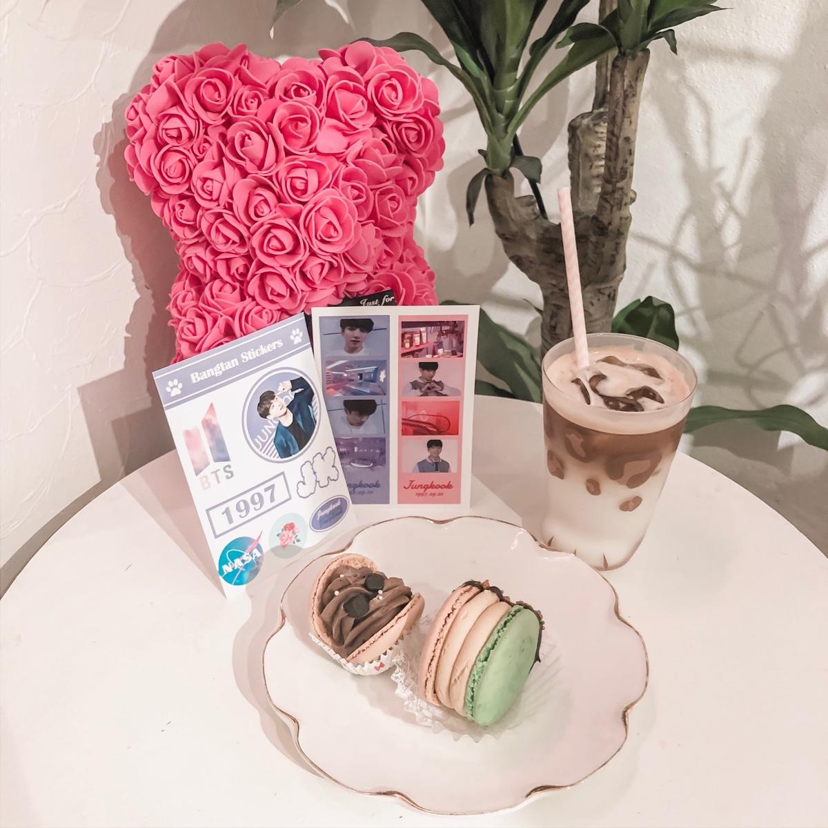 不知道是不是因為去的前後幾天有電視報導所以人潮超級多,他的店內內用的位置也很少看到滿多人選擇外帶,裝潢佈置方面覺得不錯也是走那種好拍網美路線~其實本身對馬卡龍沒什麼太大興趣比起來還是蛋糕鬆餅類比較吸引我,也以為應該是外表好看又很少女才有這麼多人殊不知我一吃立馬要收回前言XD雖然對我來說有稍微甜一點但完全可以接受尤其我又點了一杯拿鐵綜合一起完全很可以阿!推薦大家來試試看~這次人太多就沒拍店外了不然覺得小小家蠻可愛的哈哈哈