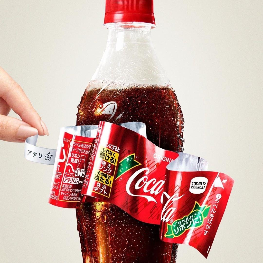 每年快到聖誕節時,日本可口可樂的包裝會變得很有聖誕節的氣息,外包裝看似跟平常一樣,但它其實有一個小機關,在邊邊有一條小標籤,慢慢撕開標籤可樂的外包裝紙會變成一個蝴蝶結!非常可愛!