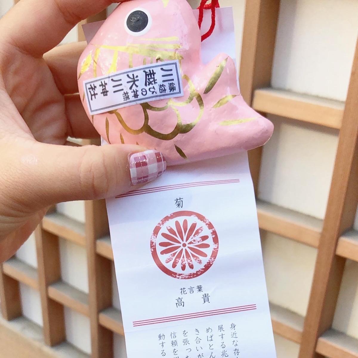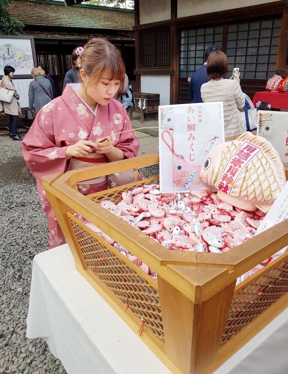 #冰川神社 的籤是超可愛的鯛魚🐟 紅色的鯛魚是求平安 一年安鯛日文也取了諧音就是一年安泰 其餘粉色、白色、橘色都是求姻緣~ #良緣あい鯛 - 不過這不是直接拿的 投¥300元硬幣之後,拿起旁邊小釣竿 自己籤自己釣🎣 (後面有影片📷 雖然不知道寫了什麼,但釣到大吉就開心🥳