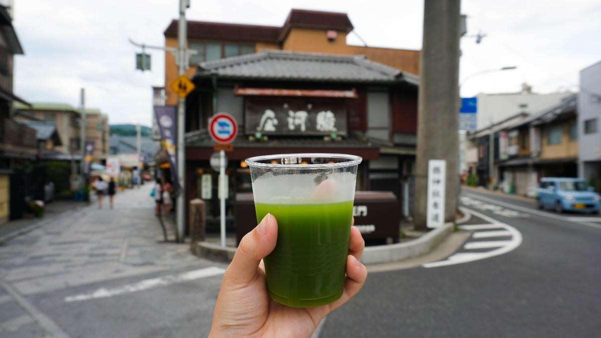 讓我們回到宇治,我決定在這裡喝杯真正、道地的苦抹茶,逛完通往平等院的那條賣著滿滿抹茶周邊商品和料理(居然有抹茶煎餃)的商店街,在有名的「伊藤久右衛門」買了我唯一的抹茶周邊商品-抹茶蕨餅後,選擇位在街口的第一家店,看到些許人也買了冰抹茶就跟著買來喝,只能說日本商家對觀光客的服務真的很周到,正當我準備好做出苦上眉梢的表情,喝一口就發現居然很替觀光客著想的加了糖。我果然還是沒準備好入境隨俗,甜甜的真的比較好喝,只是這一杯的量真的太少啦!!