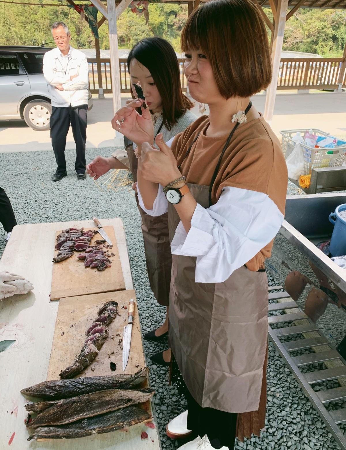 處理完鰹魚,跟しんじょう君一起用稻草直烤,