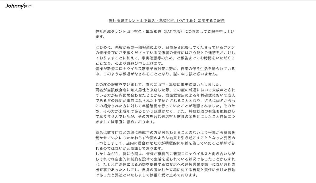 雖然這次的事件起因是女方謊報年齡所引起,但傑尼斯事務所仍認為山下智久、龜梨和也在疫情期間發生這樣的事情是缺少了自覺及責任感,所以暫時停止山下智久的演藝活動、龜梨和也也作出書面反省,來為這次的事件向大眾道歉。