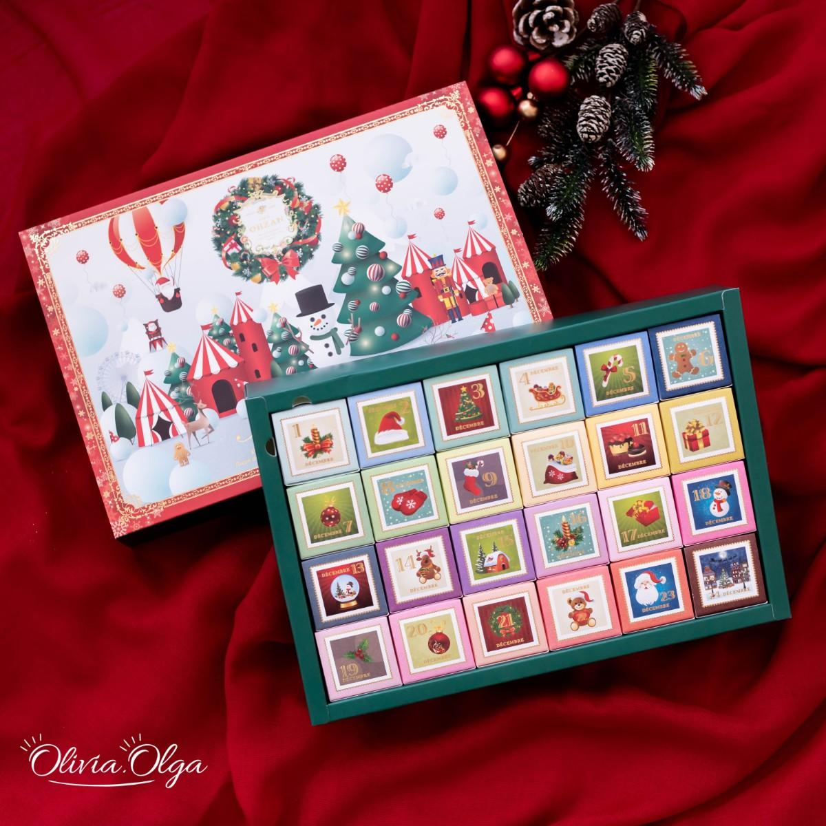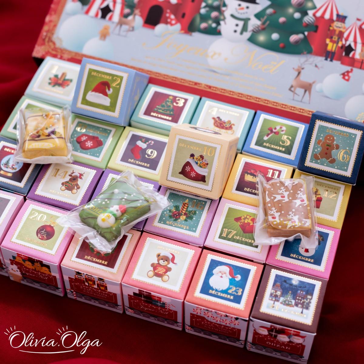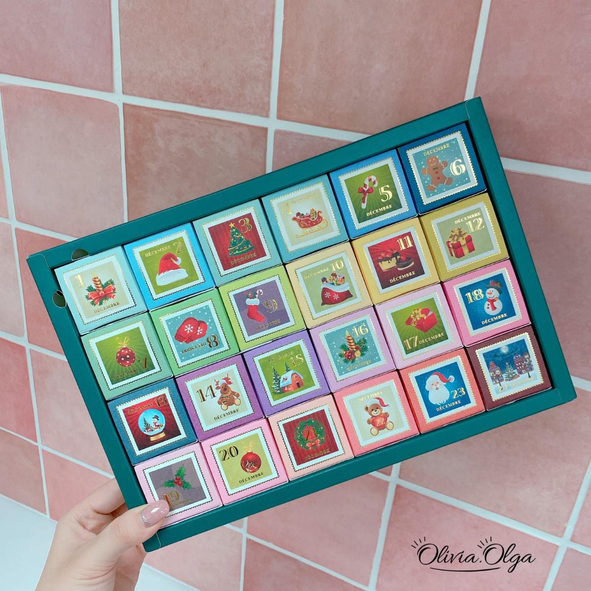 感謝日本的好友特別寄來的聖誕禮物。這盒超級夢幻的倒數月曆是由日本人氣伴手禮店CAFE OHZAN推出的,每一個小盒子裡都裝著一個充滿節慶感的可愛點心,小小一個,每天都享用也不擔心熱量太高。裡面的小點心是他們的人氣商品キューブラスク(cube rusk),將切小塊再烘乾的可頌沾附上一層比利時調溫巧克力做裝飾,每一個造型都不一樣,每天打開都是不同的驚喜喔~
