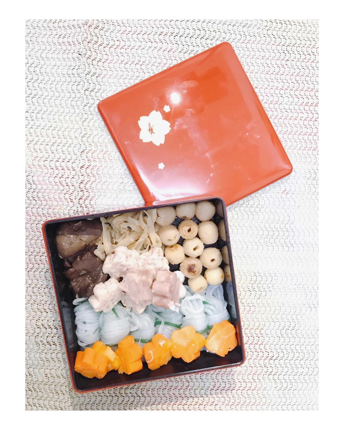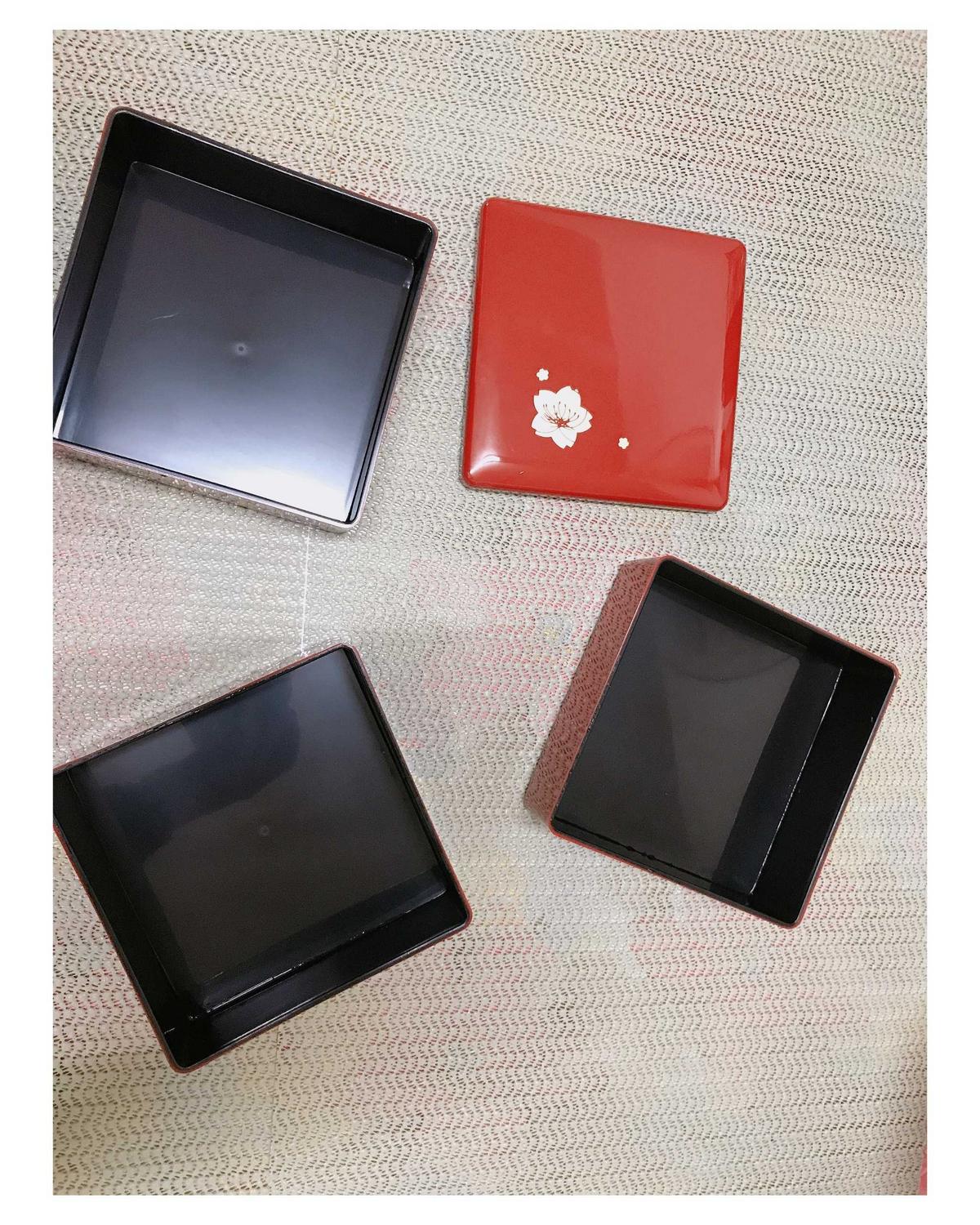 菜餚內容則也會按年菜廠商或家庭習慣而有不同,而Anna準備在新年要吃的御節料理(年菜)中,這次準備了以下東西:從日本亞馬遜訂了一個原汁原味的三段重,也就是裝御節料理的盒子(重盒(じゅうばこ)),由於希望這個盒子也能在我們的農曆新年使用,選了一個紅色的比較喜氣。