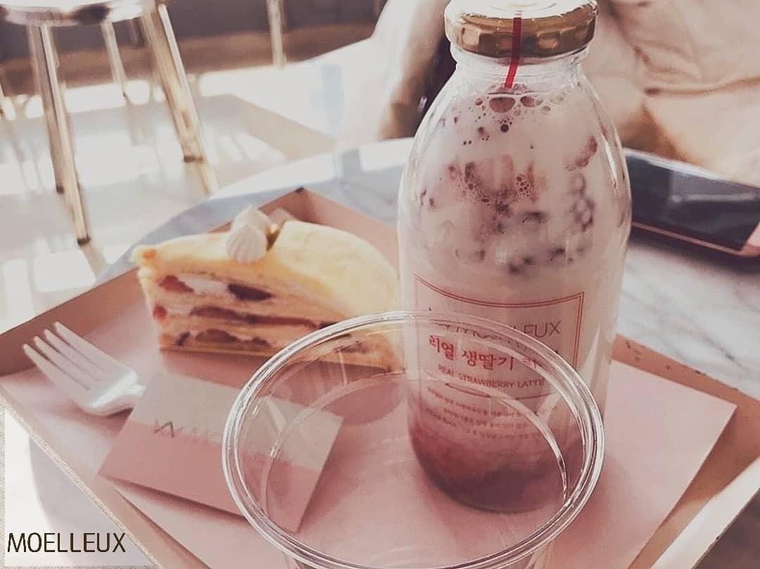 後來想找吃的,於是從冬柏公園一路走到廣安大橋附近的一間甜點店Moelleux(圖3)!他的千層蛋糕好好吃☺朋友點草莓牛奶,我點檸檬冰茶,都蠻好喝的(餐點價位約₩5000~7500)