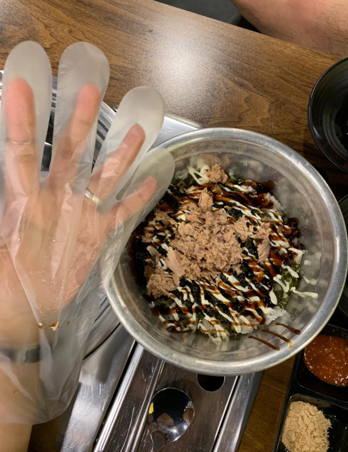 但既然因緣際會都來了,我們就點了一盆鮪魚手抓飯當主食,戴上手套抓成飯糰真的很好食啊!😝😝