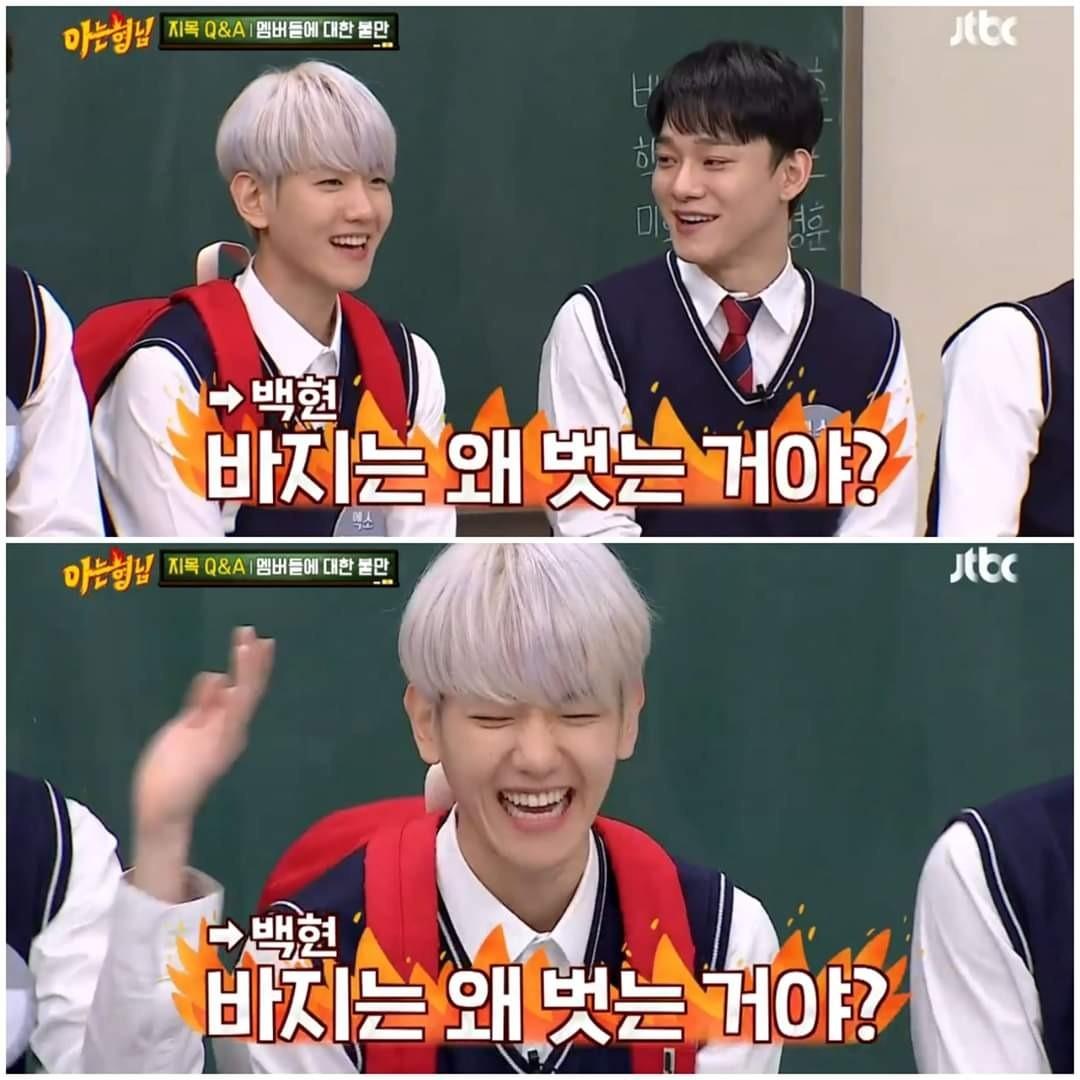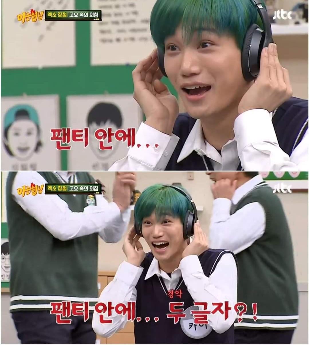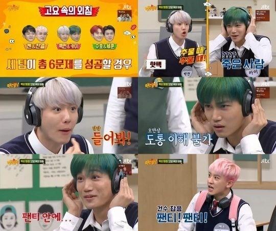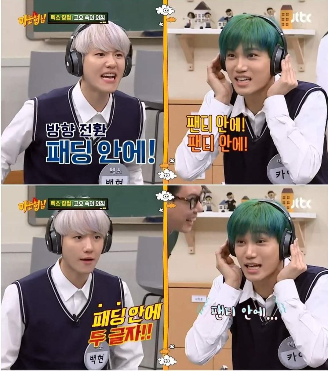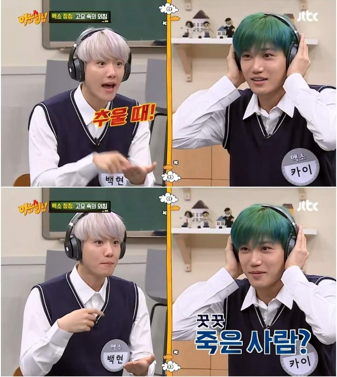 這一組真的太讓人笑瘋,雖然不太會猜,但是很有達到娛樂的效果!伯賢先說韓文「冷的時候」,但是KAI一直猜成「死的人」,讓伯賢氣得大喊:「聽我說!」,「冬天」也猜成「海雲台」,KAI自己一直猜不出來也急的直跳腳,最後還一直說「為什麼總是死了」,最後伯賢提示「冷的時候,羽絨衣裡面的,兩個字」,結果KAI猜成「內褲裡面,2個字」,害他慌張往自己褲襠一看,然後緊張的大喊,「在節目裡能講嗎?沒關係嗎?」瞬間整個大家笑瘋倒在地上,主持群則是趕快制止怕KAI說出18禁的答案,相當爆笑!!XDXDXD