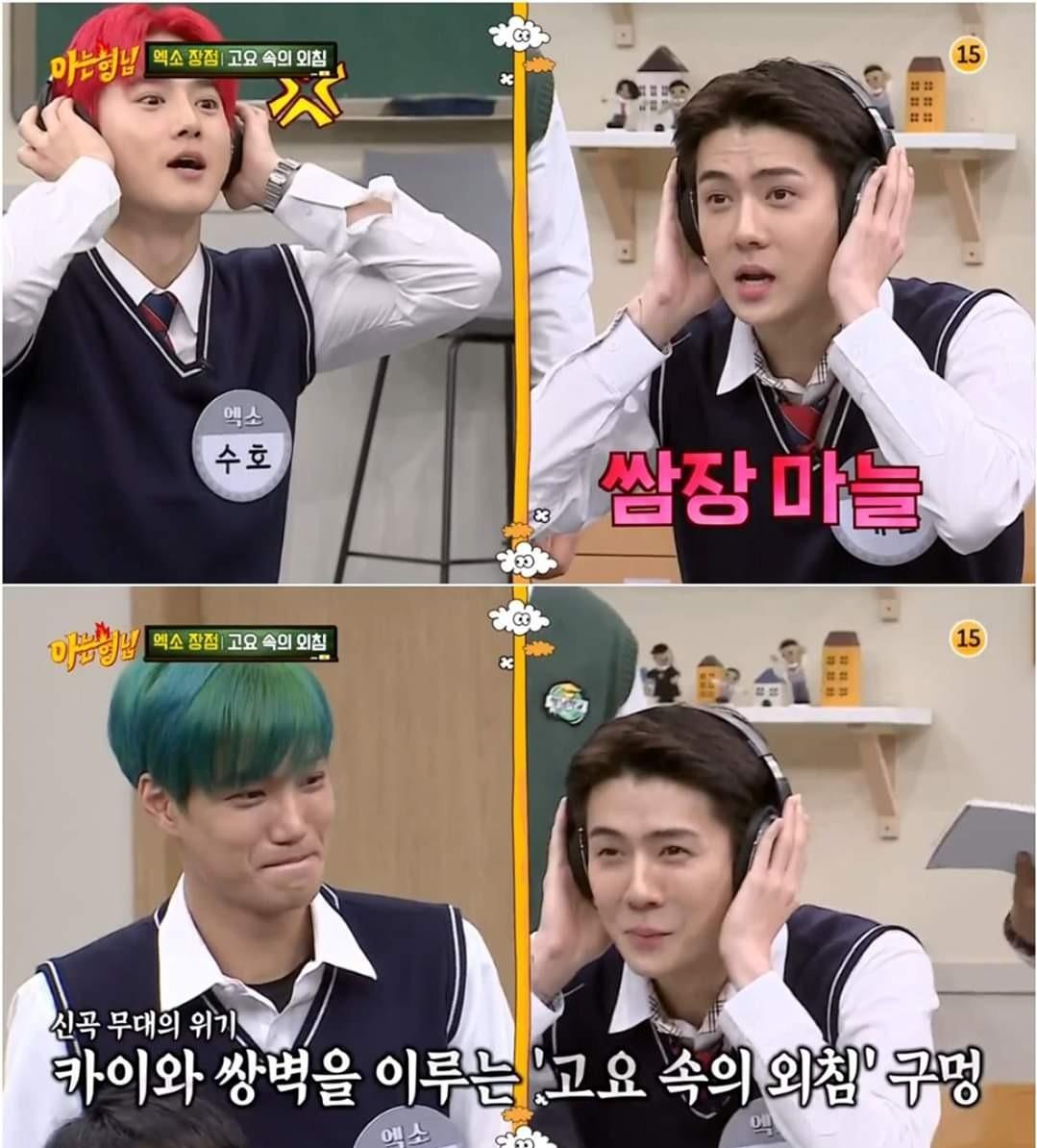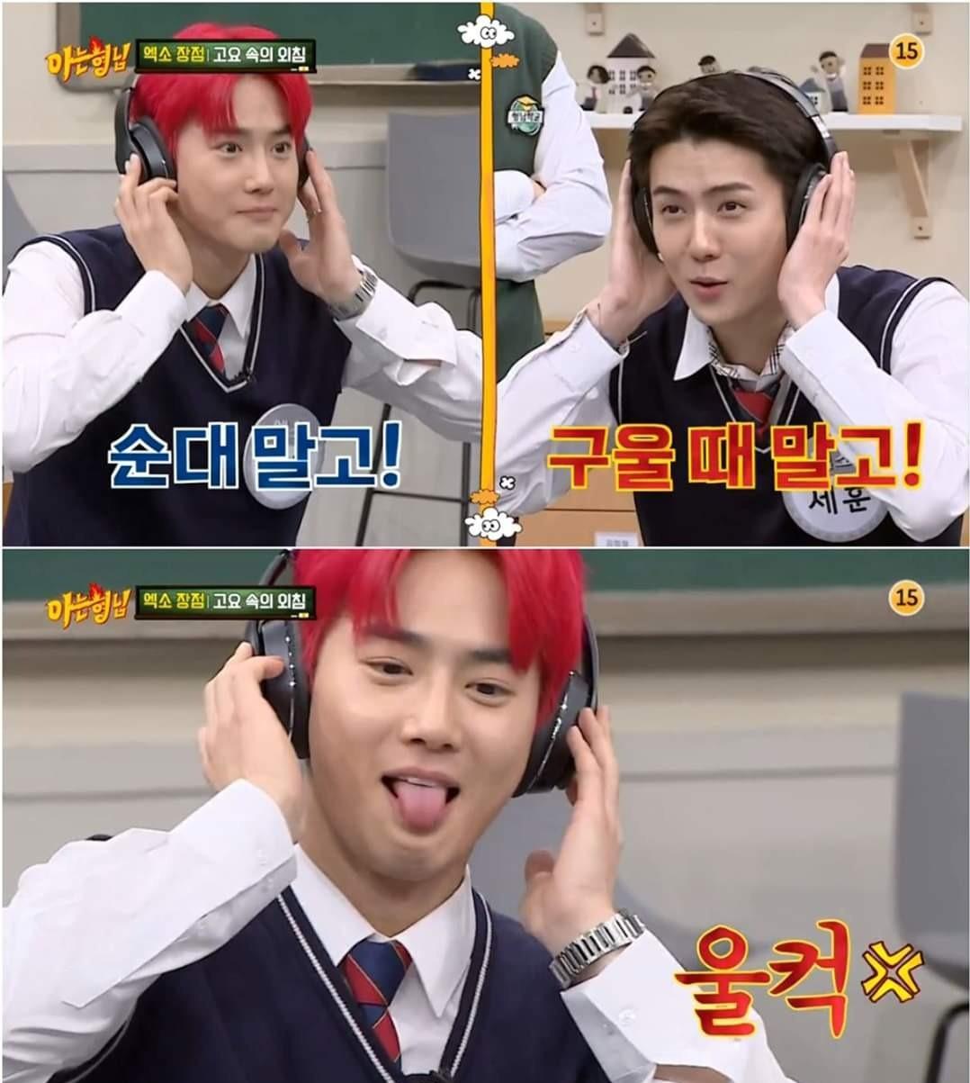 SUHO一直喊話,世勛則是一直說「聽不見」,讓大家笑瘋,因為這個環節本身設定就是聽不到的,要用嘴型來猜,中間也不斷猜錯,讓SUHO睜大眼睛,快講到崩潰,結果猜到最後一題都沒答對,讓大家笑慘!