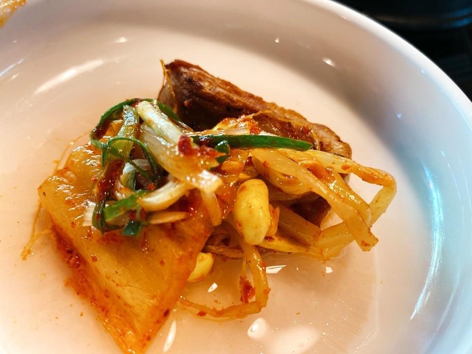 烤肉可以搭配他們的泡菜再用蘿蔔片包起來吃~就很好吃!