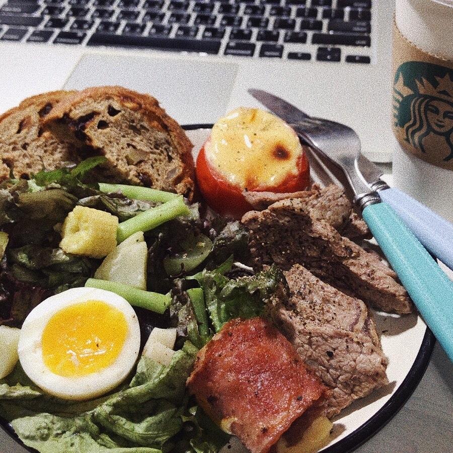 一天最喜歡的就是早餐!!! 但太晚起床又不想化妝出門(所以自己做!!) 焗烤番茄馬鈴薯 🍅🥔 乾煎牛小排 🥩 起司培根🧀️🥓 沙拉⋯⋯ 🥚🥗🥖🌽🥬🍞 #文文愛下廚