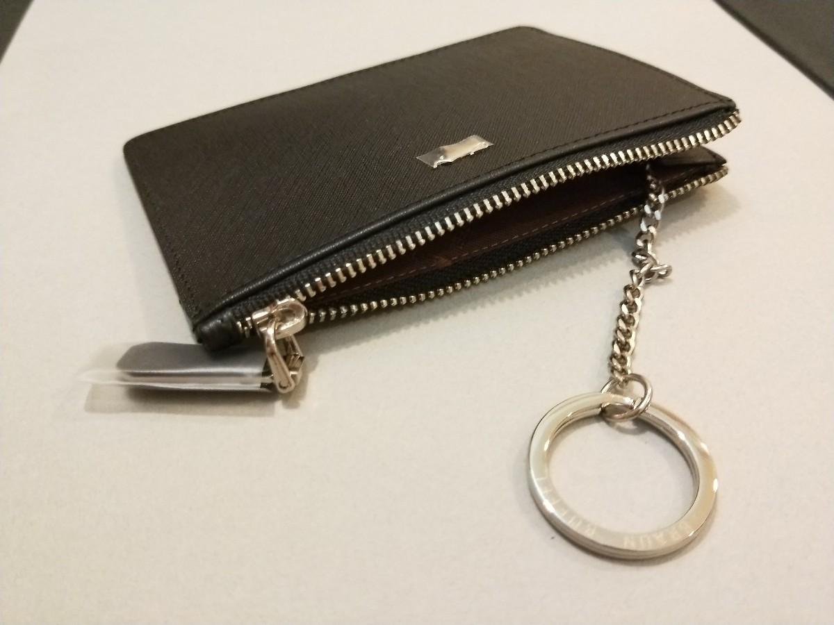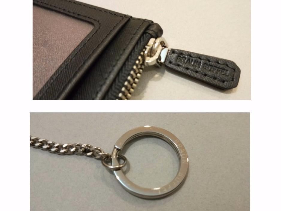做工精緻,正面是經典小金牛銀色logo,背面是品牌壓紋,連拉鍊頭上都帶有壓紋,裡頭的鑰匙圈上也有刻印!內裡則是滿滿的英文logo