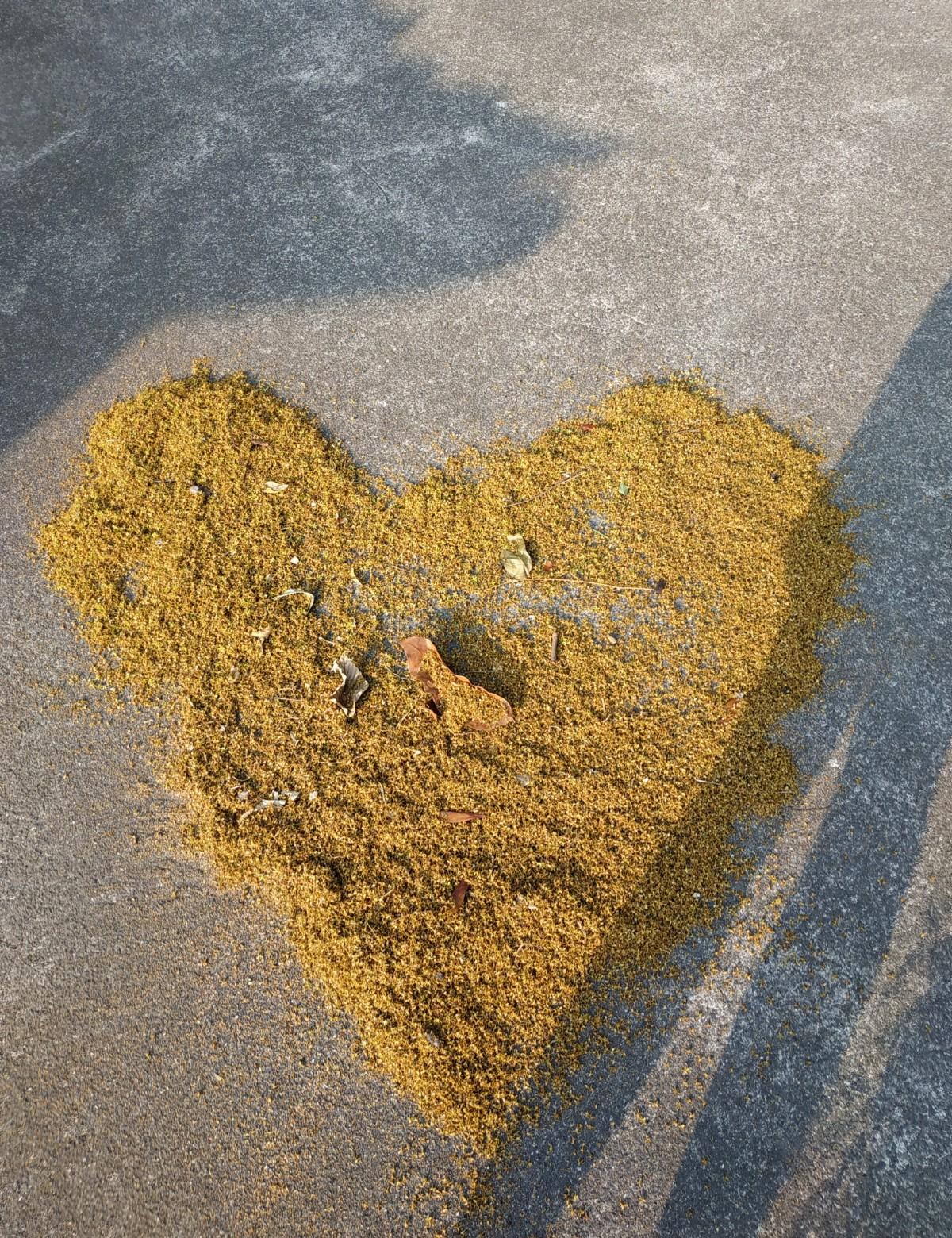 本人高一女生一枚,這個學期負責外掃區,這幾天外掃區的樹一直掉這種花,班上的女生靈機一動就掃成愛心,連掃地都能玩出新花樣,特別美❤️
