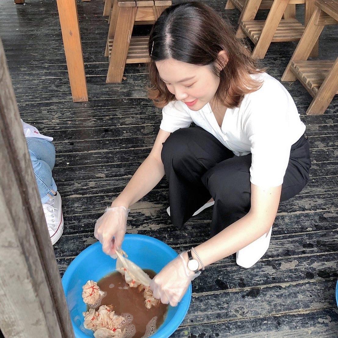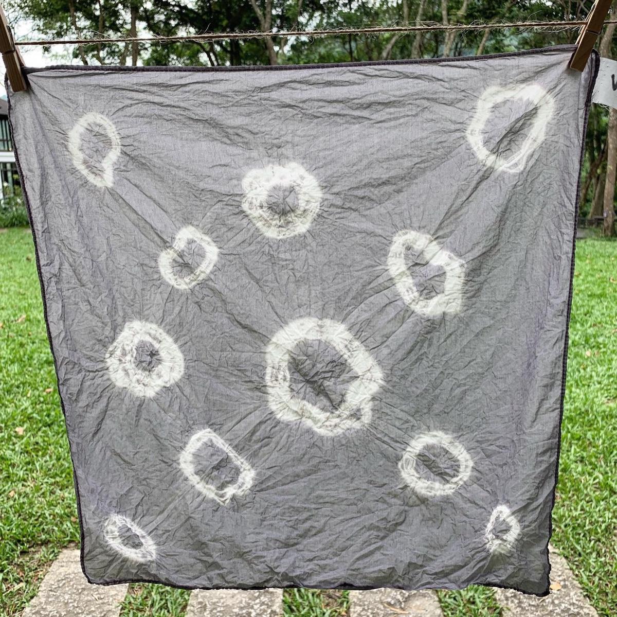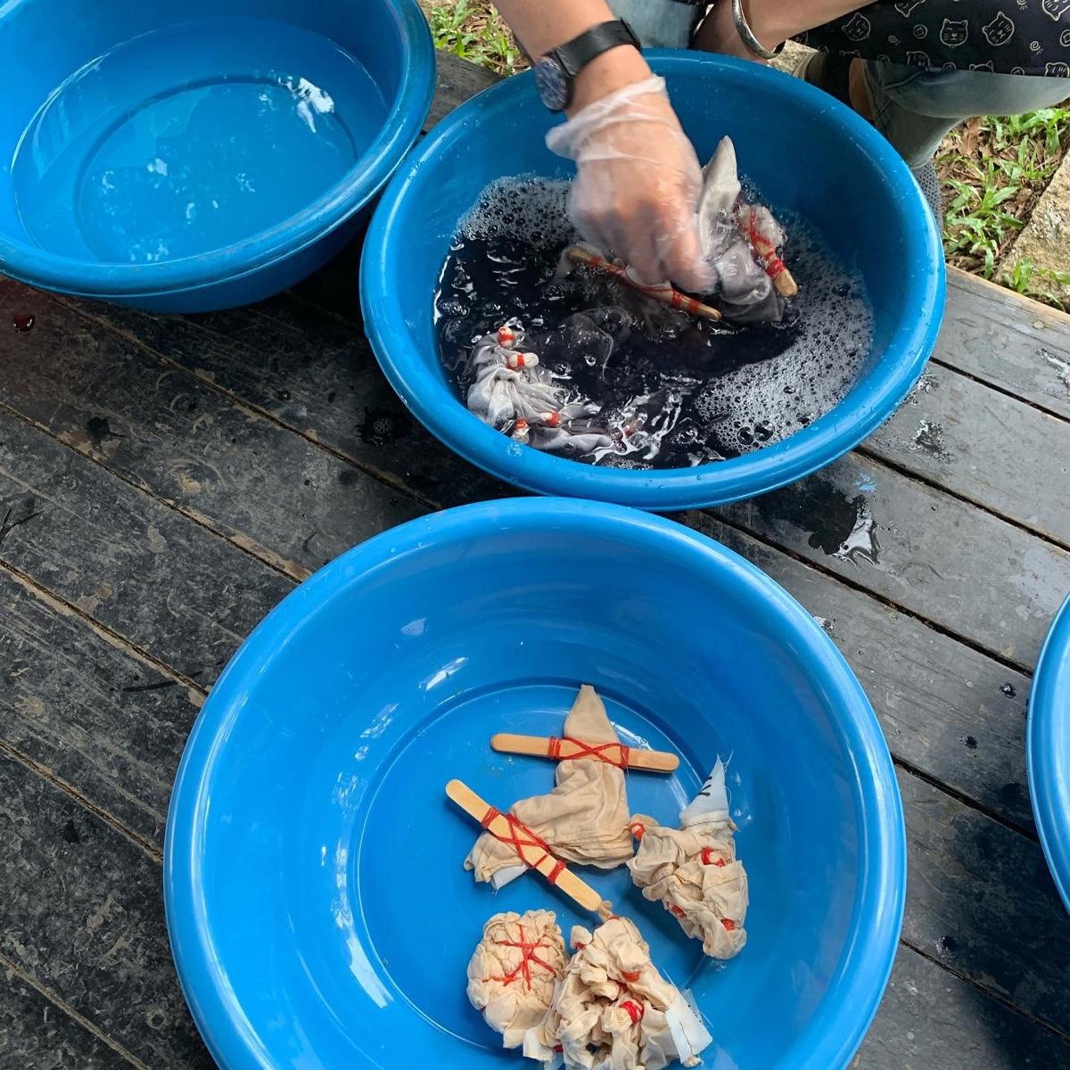 透過構思想像紋樣後,開始著手綁紮,再藉由浸染、定色、洗滌、晾曬完成一件不可預測、如幻化魔術般的一塊布。(๑˃̵ᴗ˂̵)