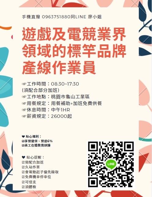 桃園龜山工業區 電競御用品牌 中產線作業員