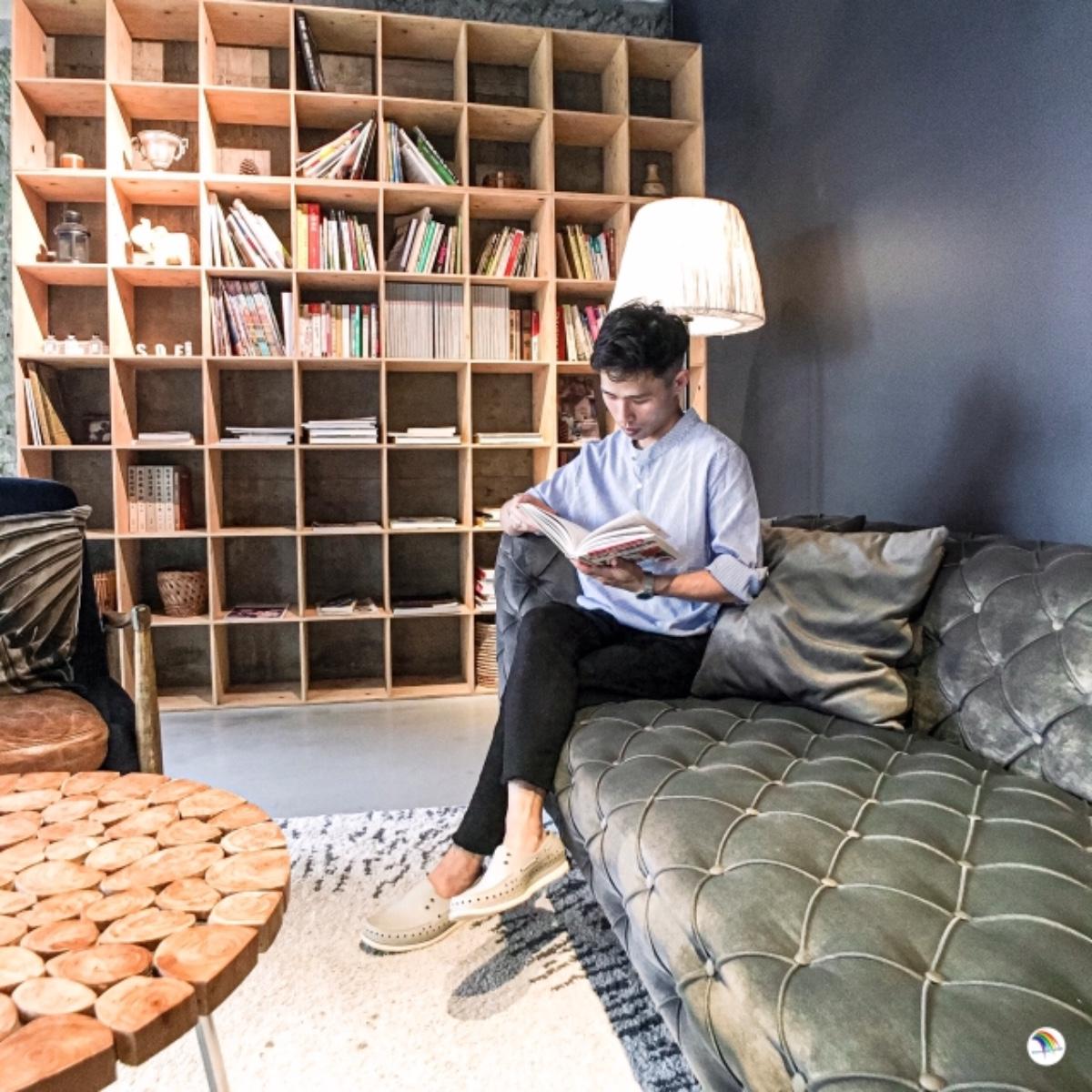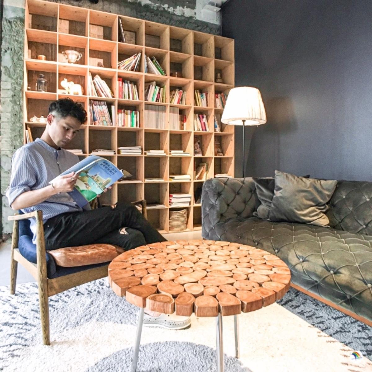 舒適的沙發🛋️搭配一旁的格子書櫃牆